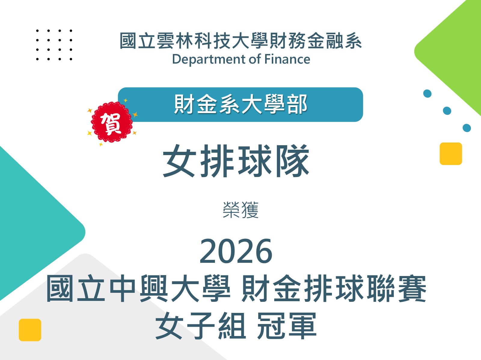 2026-04-23Congratulations! The Department of Finance Undergraduate Women's Volleyball Team won the Championship in the Women's Division of the 2026 National Chung Hsing University Finance Volleyball Tournament