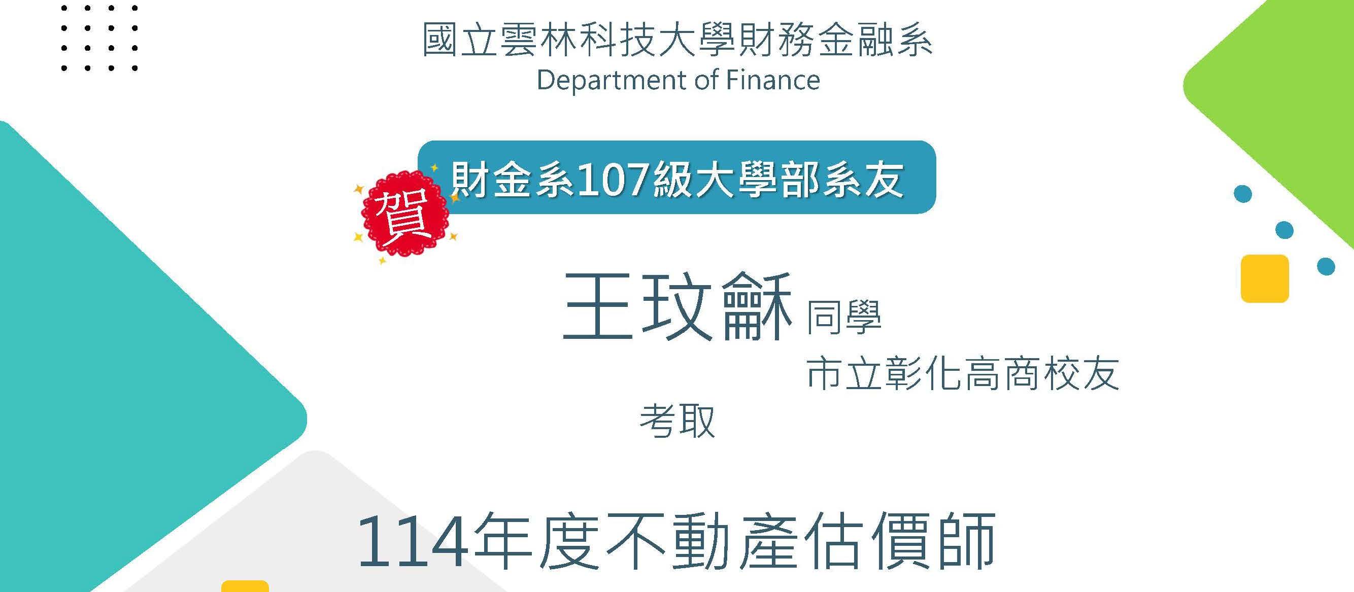 賀!財金系107級大學部同學王玟龢考取114年度不動產估價師