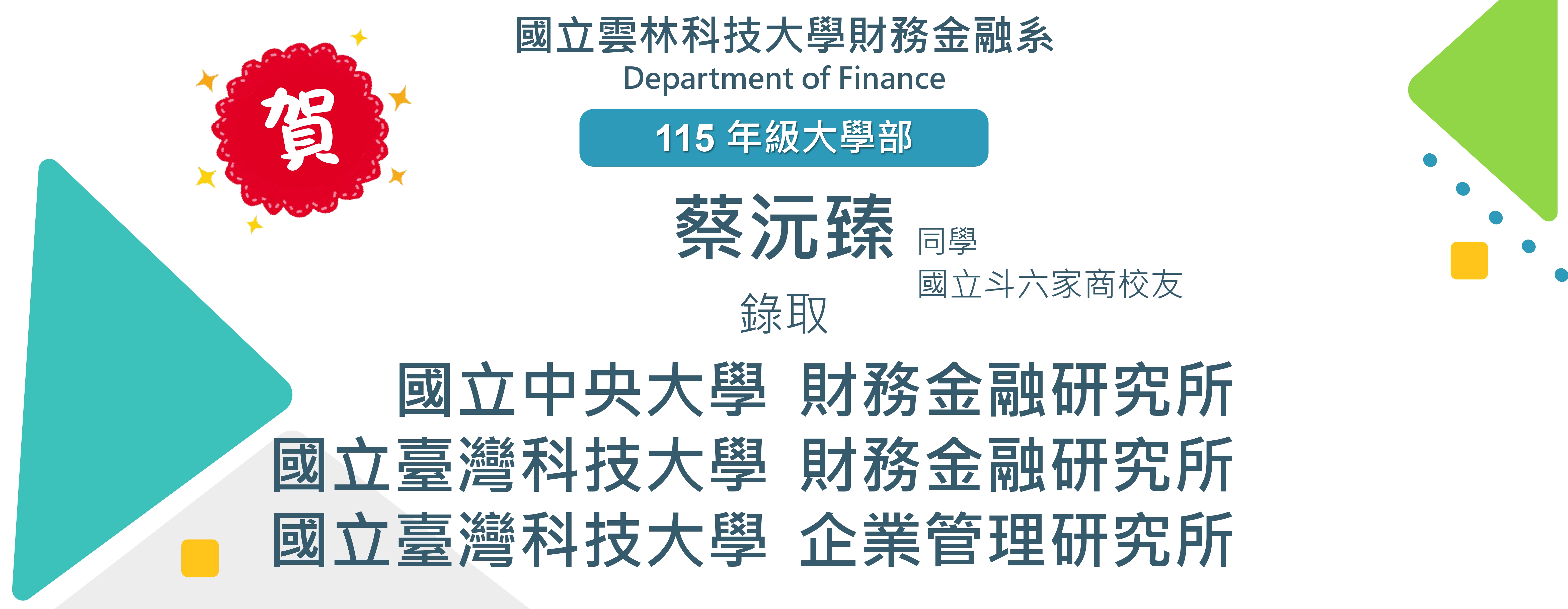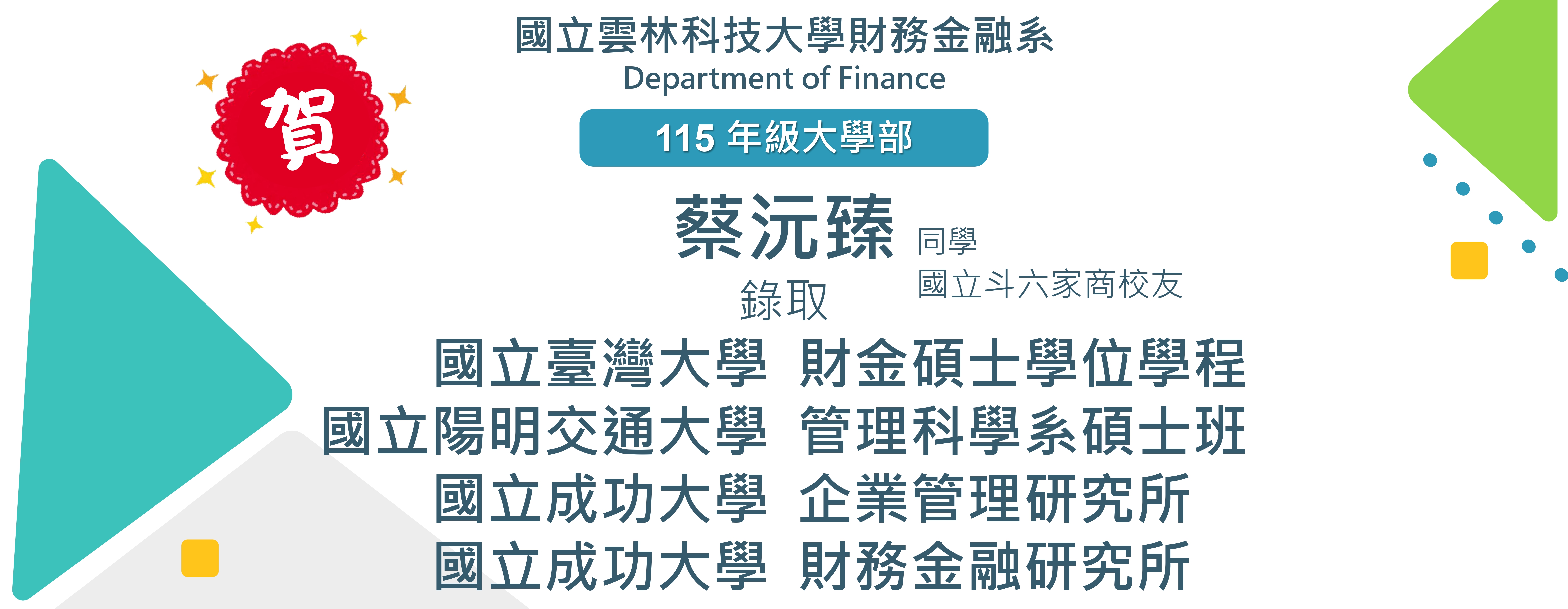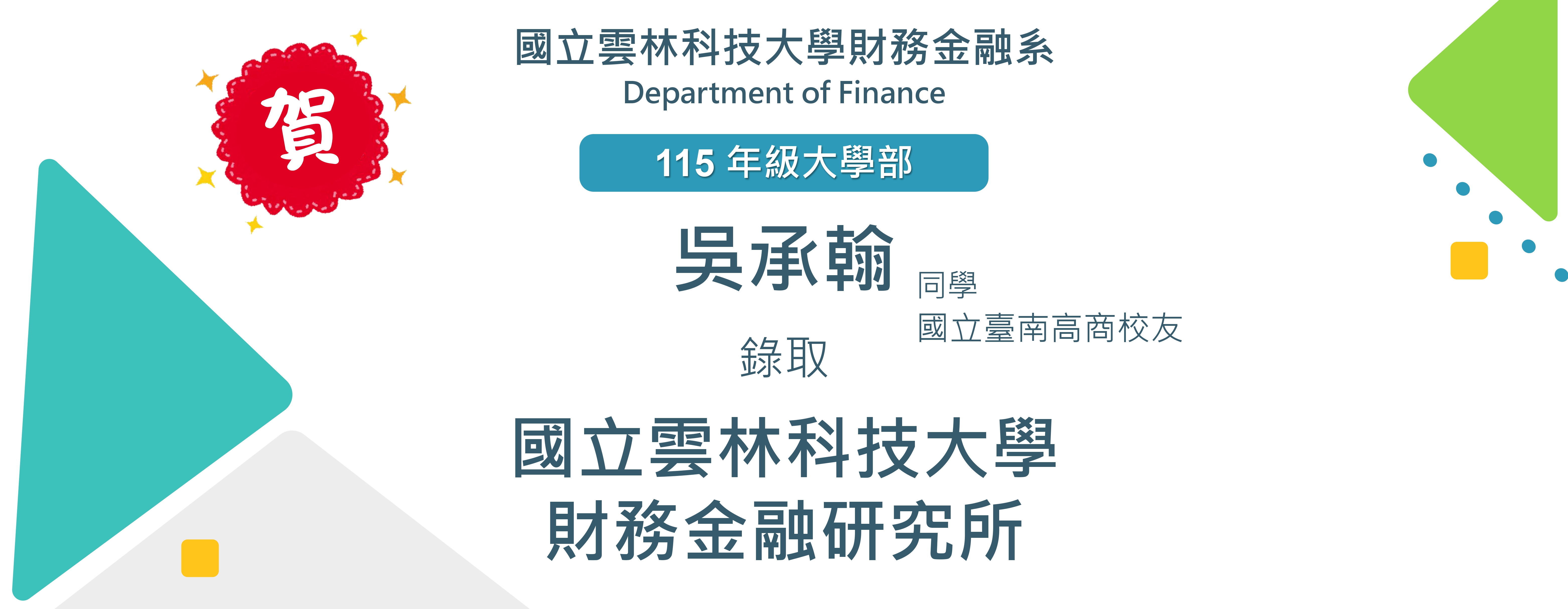賀!財金系大學部四年級吳承翰同學 考取 國立雲林科技大學 財務金融研究所