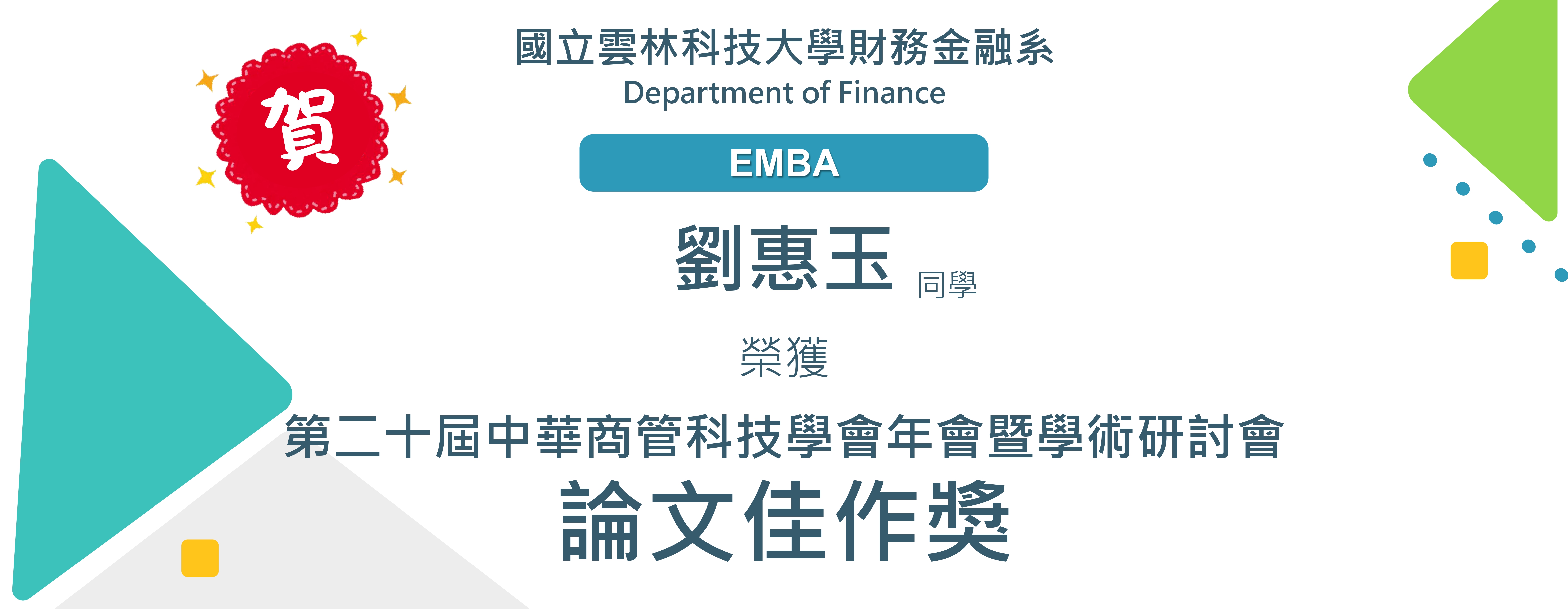賀!財金系EMBA碩班劉惠玉同學榮獲第二十屆中華商管科技學會年會暨學術研討會 論文佳作獎