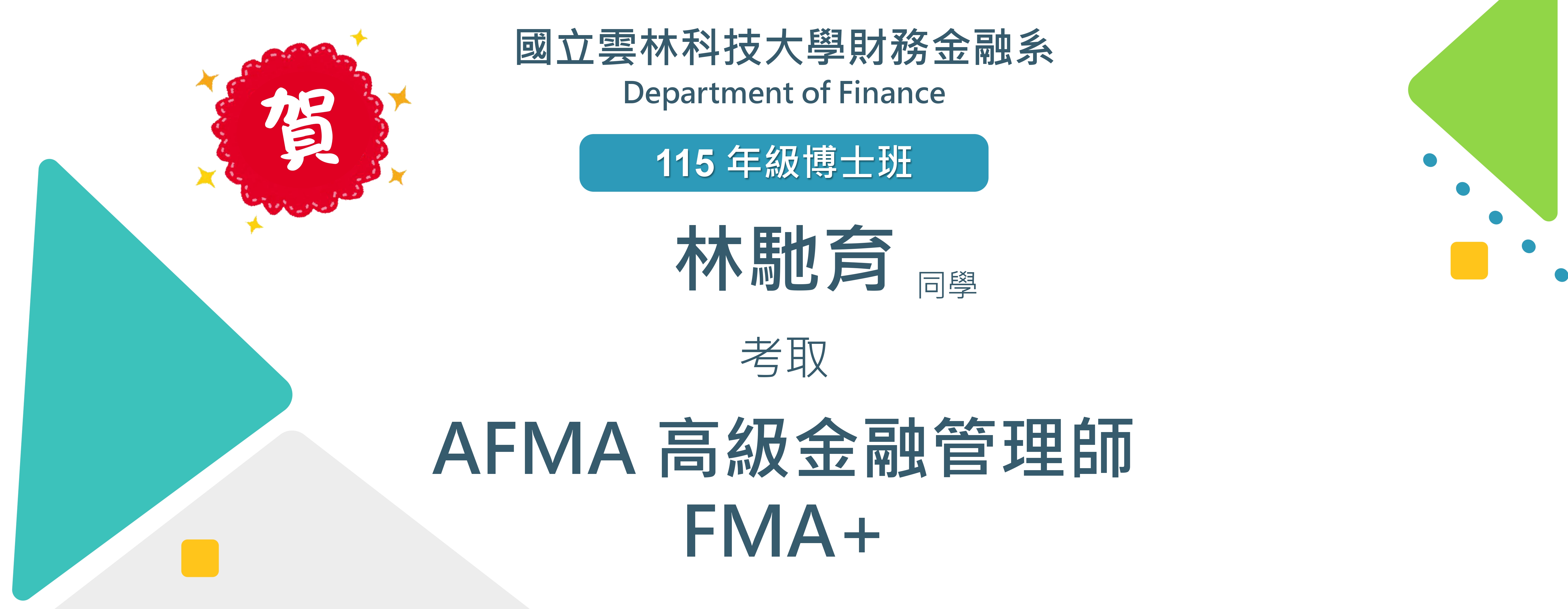 賀!財金系115年級博士班林馳育同學 取得 AFMA高級金融管理師FMA+