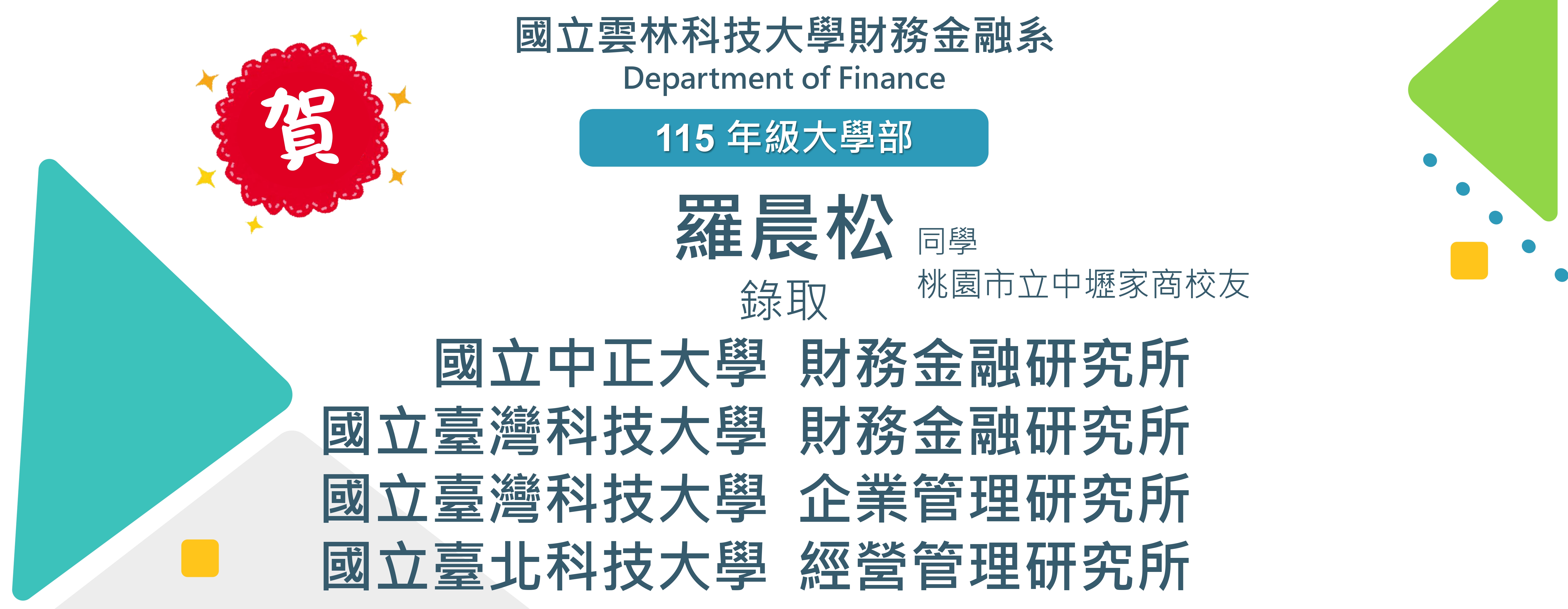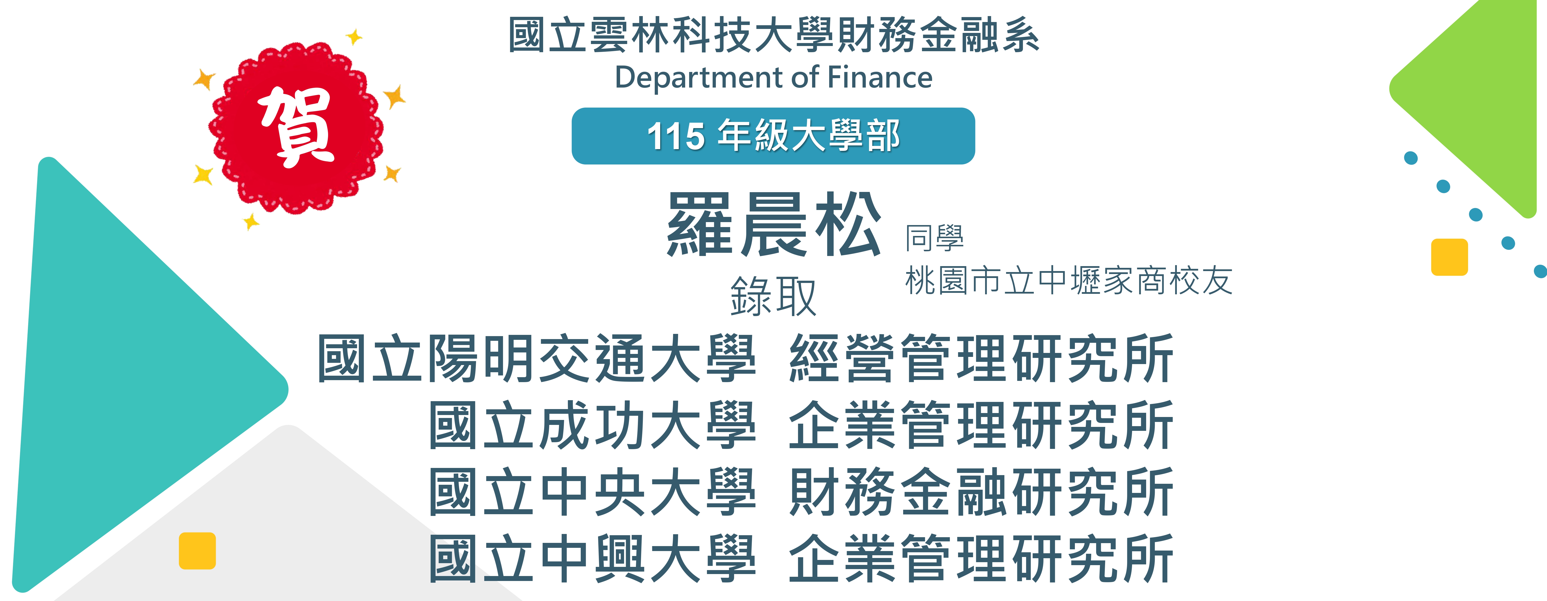 賀!財金系大學部四年級羅晨松同學 考取 國立陽明交通大學 國立成功大學 國立中央大學 國立中興大學 國立中正大學 國立臺灣科技大學 國立臺北科技大學 研究所