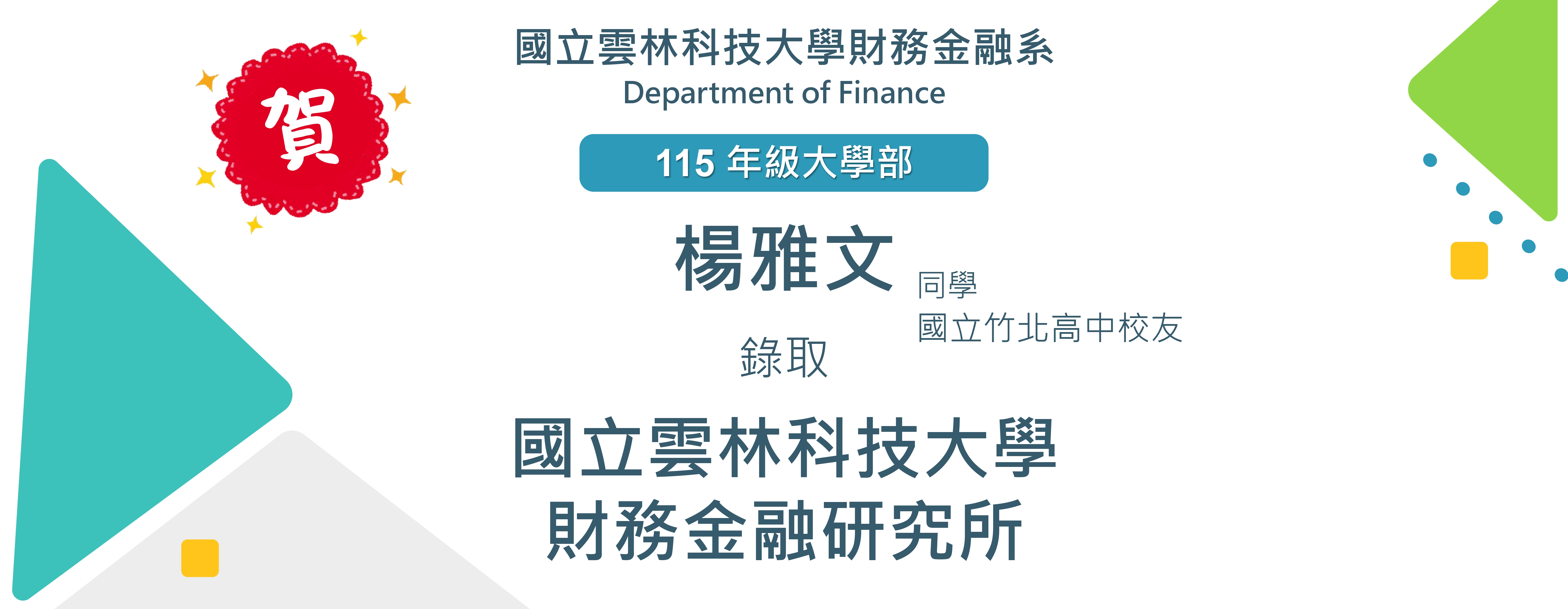 賀!財金系大學部四年級楊雅文同學 考取 國立雲林科技大學 財務金融研究所