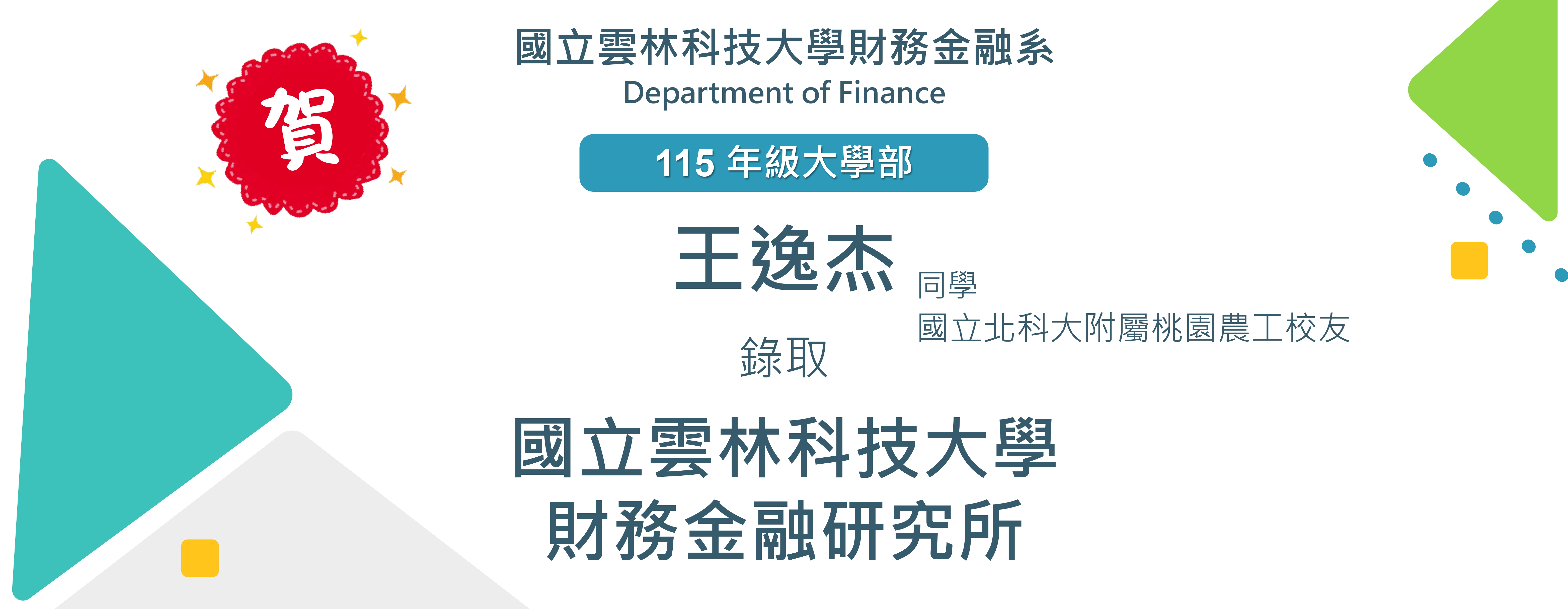 賀!財金系大學部四年級王逸杰同學 考取 國立雲林科技大學 財務金融研究所