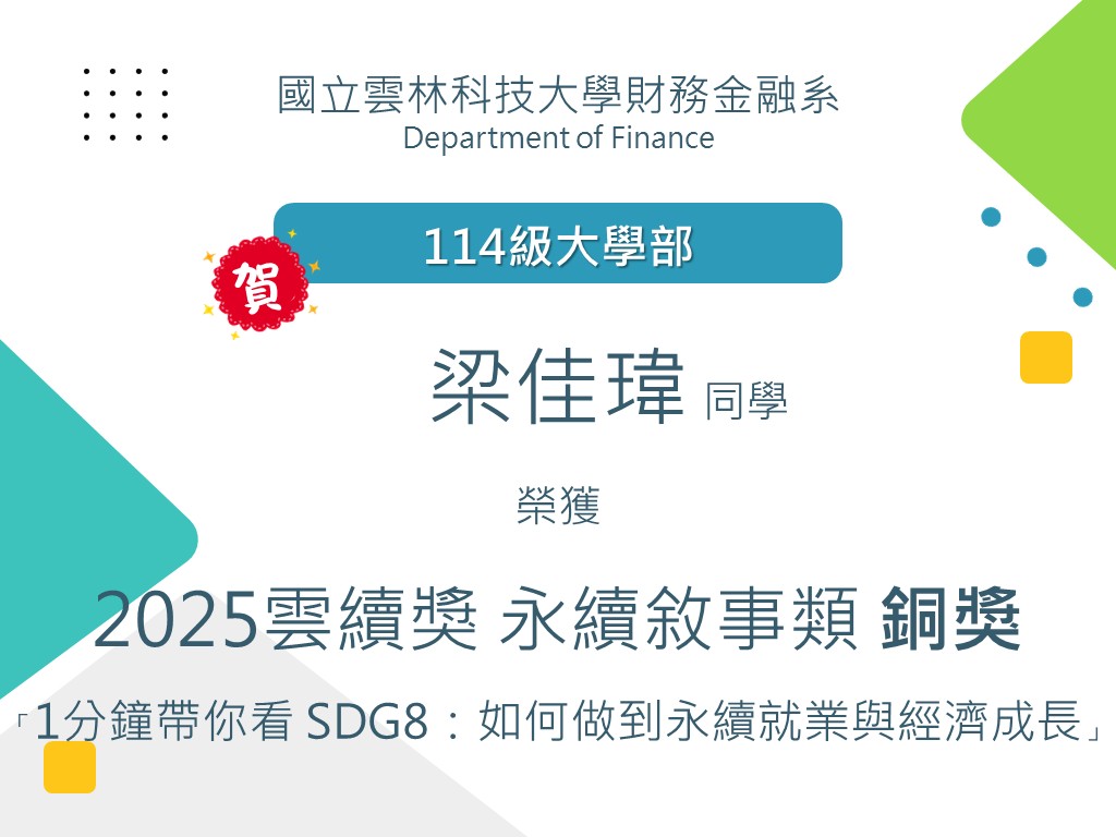 賀 梁佳瑋同學榮獲2025雲續獎 永續敘事類 銅獎