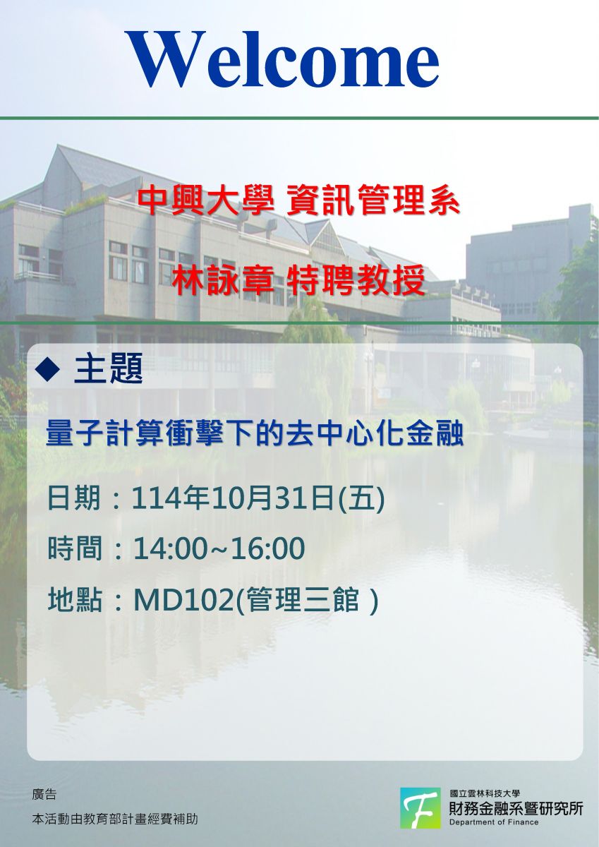 10/31(五)邀請國立中興大學資訊管理系林詠章特聘教授專題演講