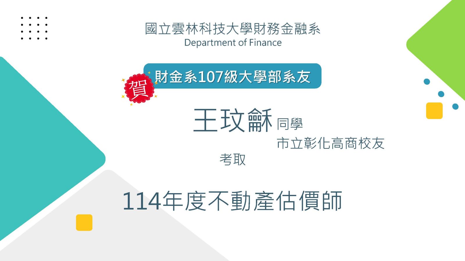 賀!財金系107級大學部同學王玟龢考取114年度不動產估價師