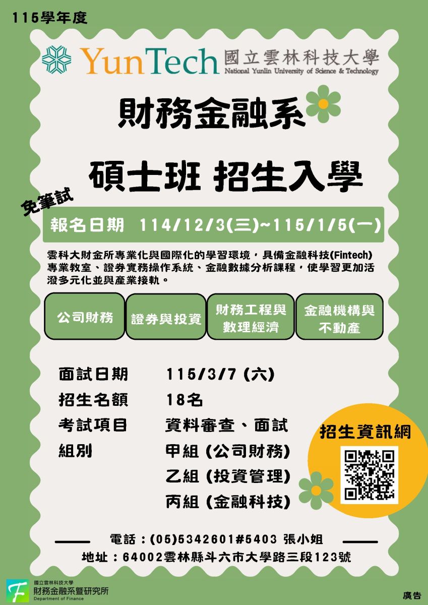 115 雲科大財務金融所碩士班招生中(115.1.5報名截止)