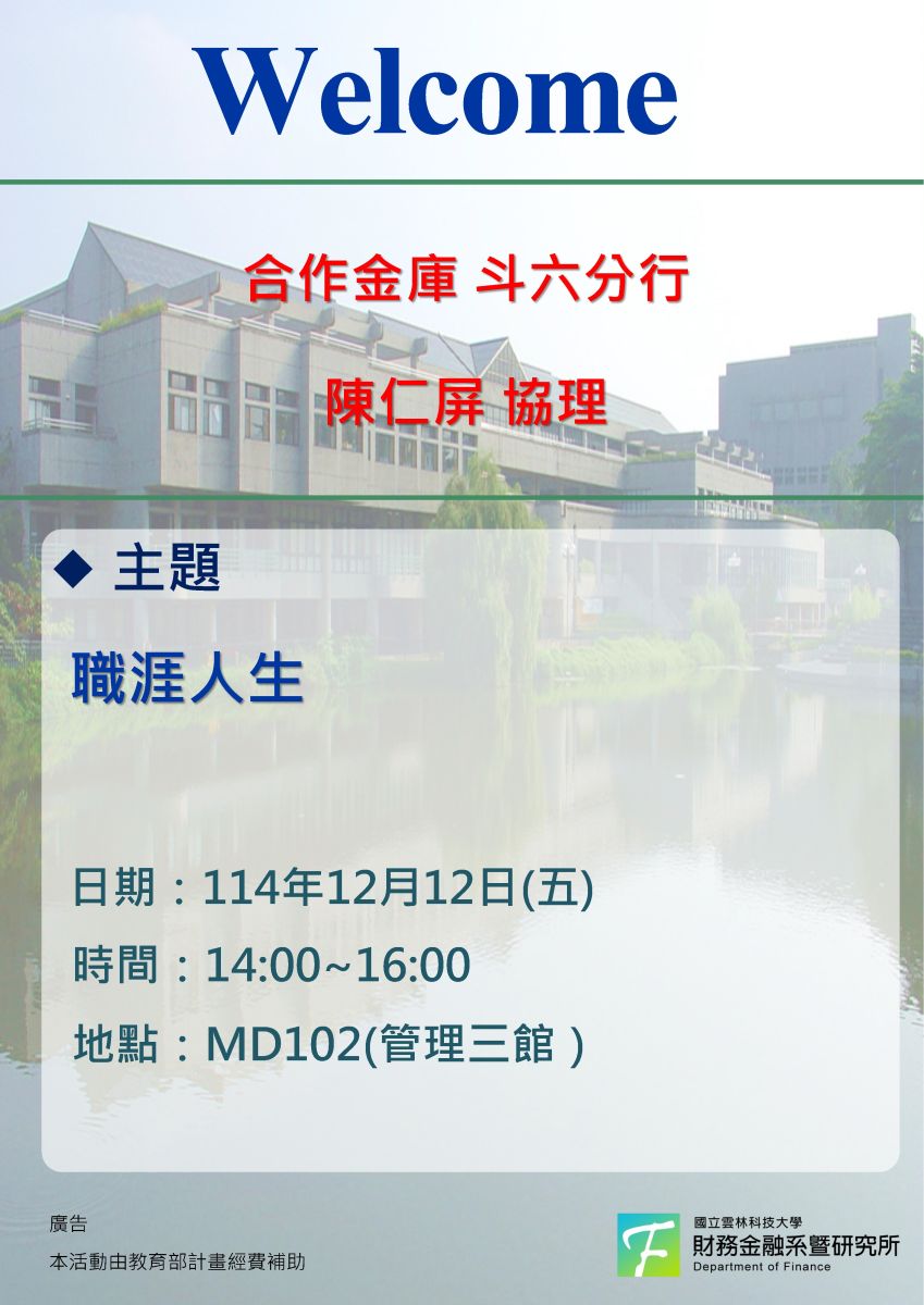 12/12(五)邀請合作金庫斗六分行陳仁屏協理專題演講
