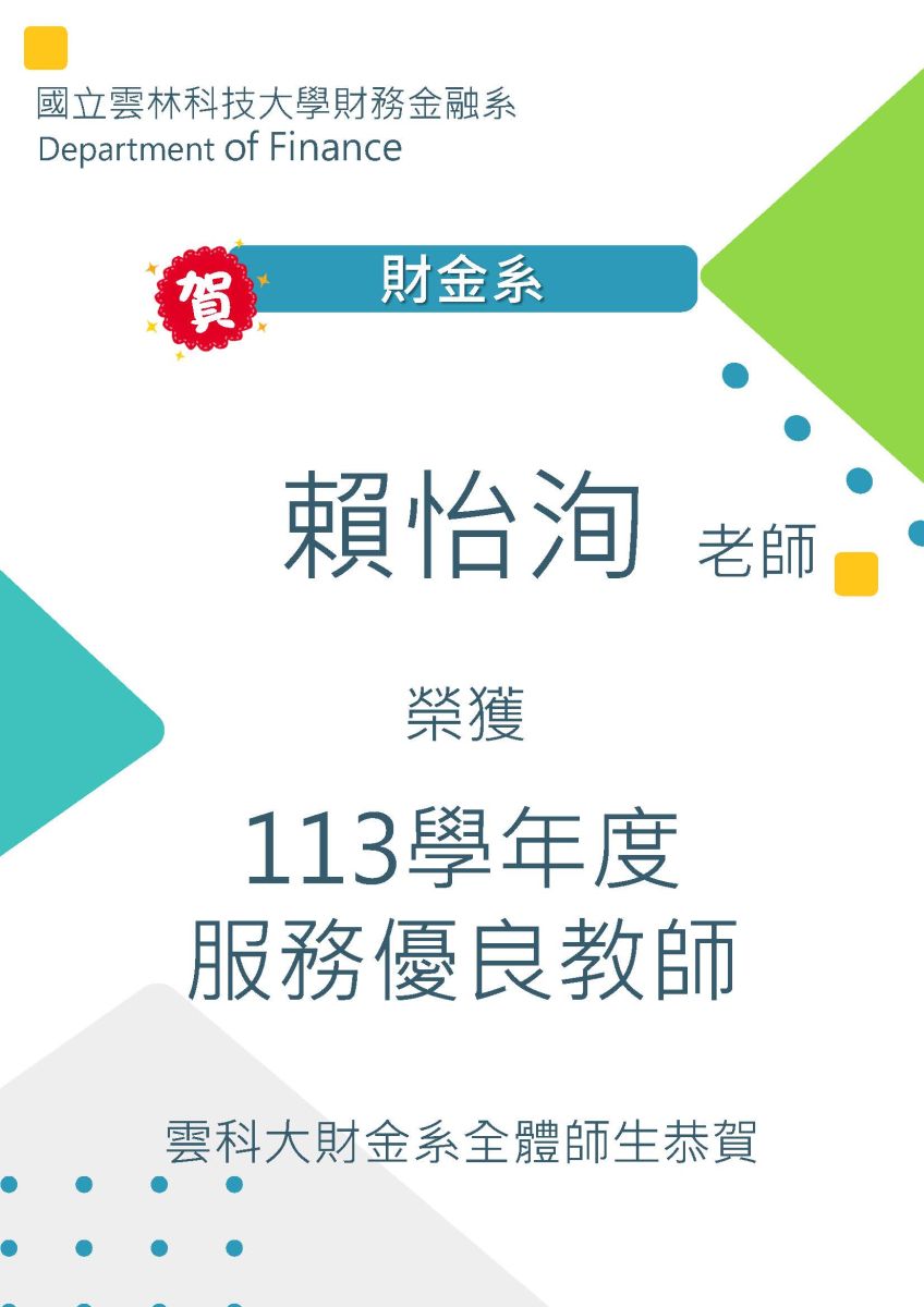 賀!財金系賴怡洵老師榮獲113學年度「服務優良教師」獎