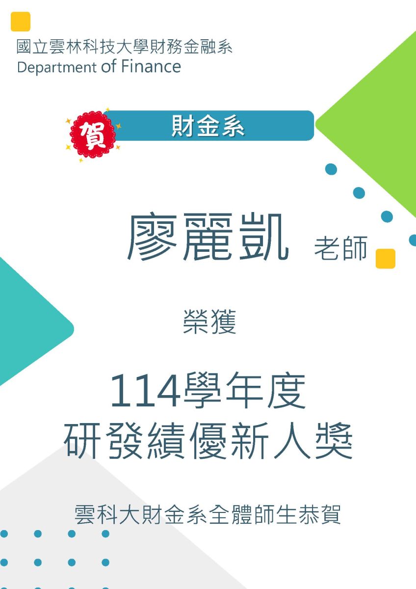 賀!財金系廖麗凱老師榮獲114學年度「研發績優新人」獎