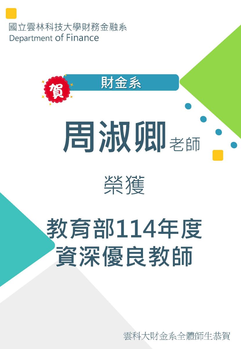 賀!財金系周淑卿老師 榮獲 教育部114年度資深優良教師