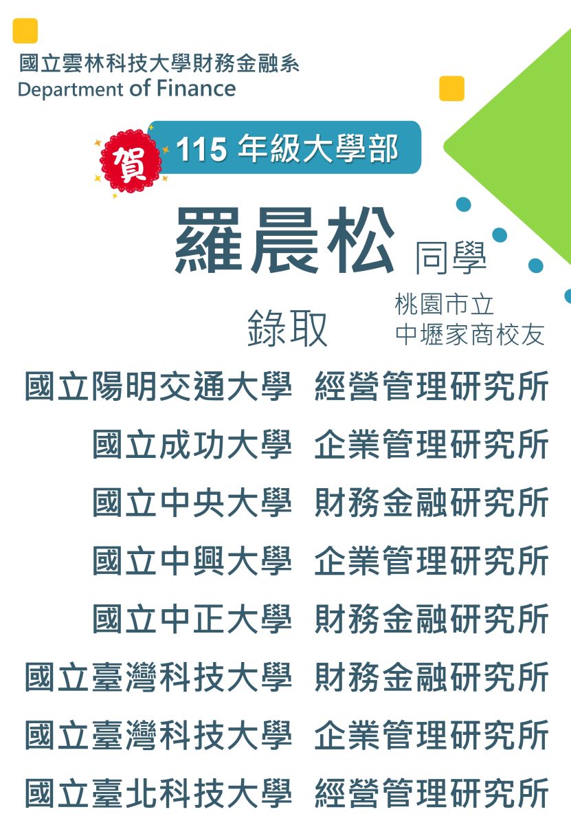 賀!財金系大學部四年級羅晨松同學 考取 國立陽明交通大學 國立成功大學 國立中央大學 國立中興大學 國立中正大學 國立臺灣科技大學 國立臺北科技大學 研究所