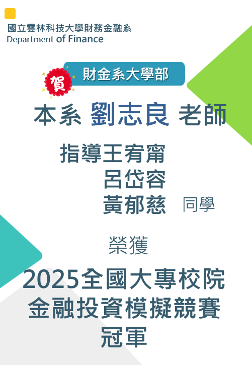 賀!本系劉志良老師指導指導王宥甯、呂岱容、黃郁慈同學 榮獲 2025全國大專校院金融投資模擬競賽 冠軍