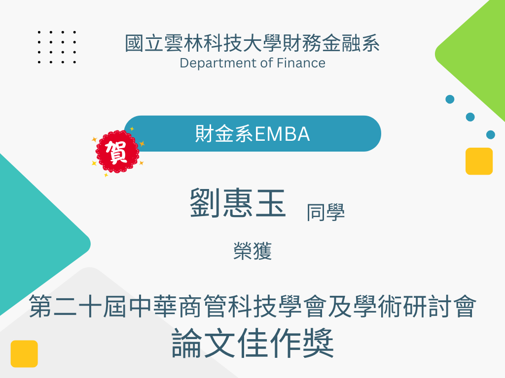 賀!財金系EMBA碩班劉惠玉同學榮獲第二十屆中華商管科技學會年會暨學術研討會 論文佳作獎