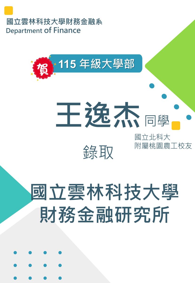 賀!財金系大學部四年級王逸杰同學 考取 國立雲林科技大學 財務金融研究所