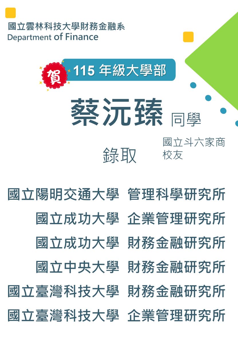 賀!財金系大學部四年級蔡沅臻同學 考取 國立陽明交通大學 國立成功大學 國立中央大學 國立臺灣科技大學 研究所