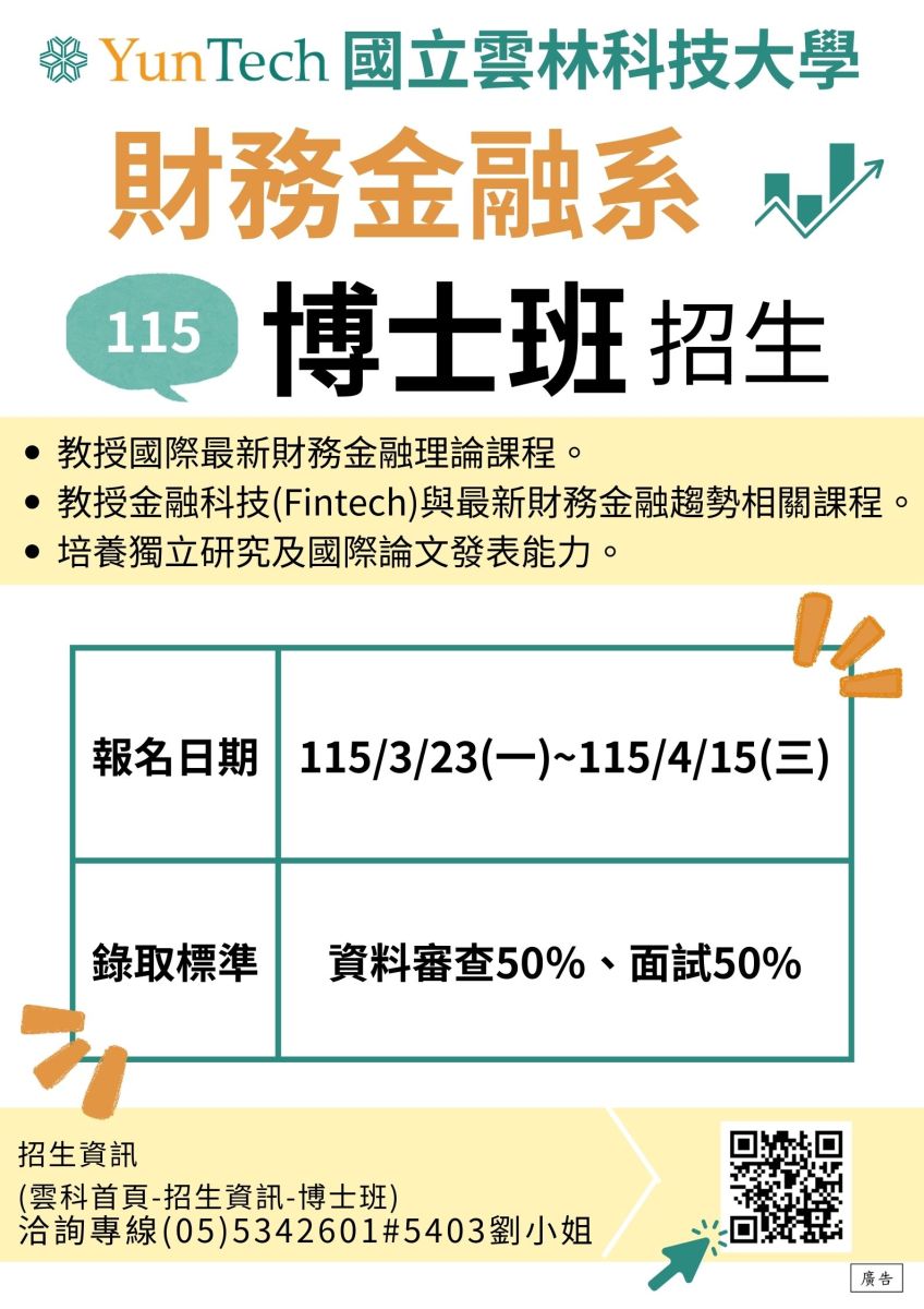 115雲科大財務金融博士班招生入學(4/15前報名)