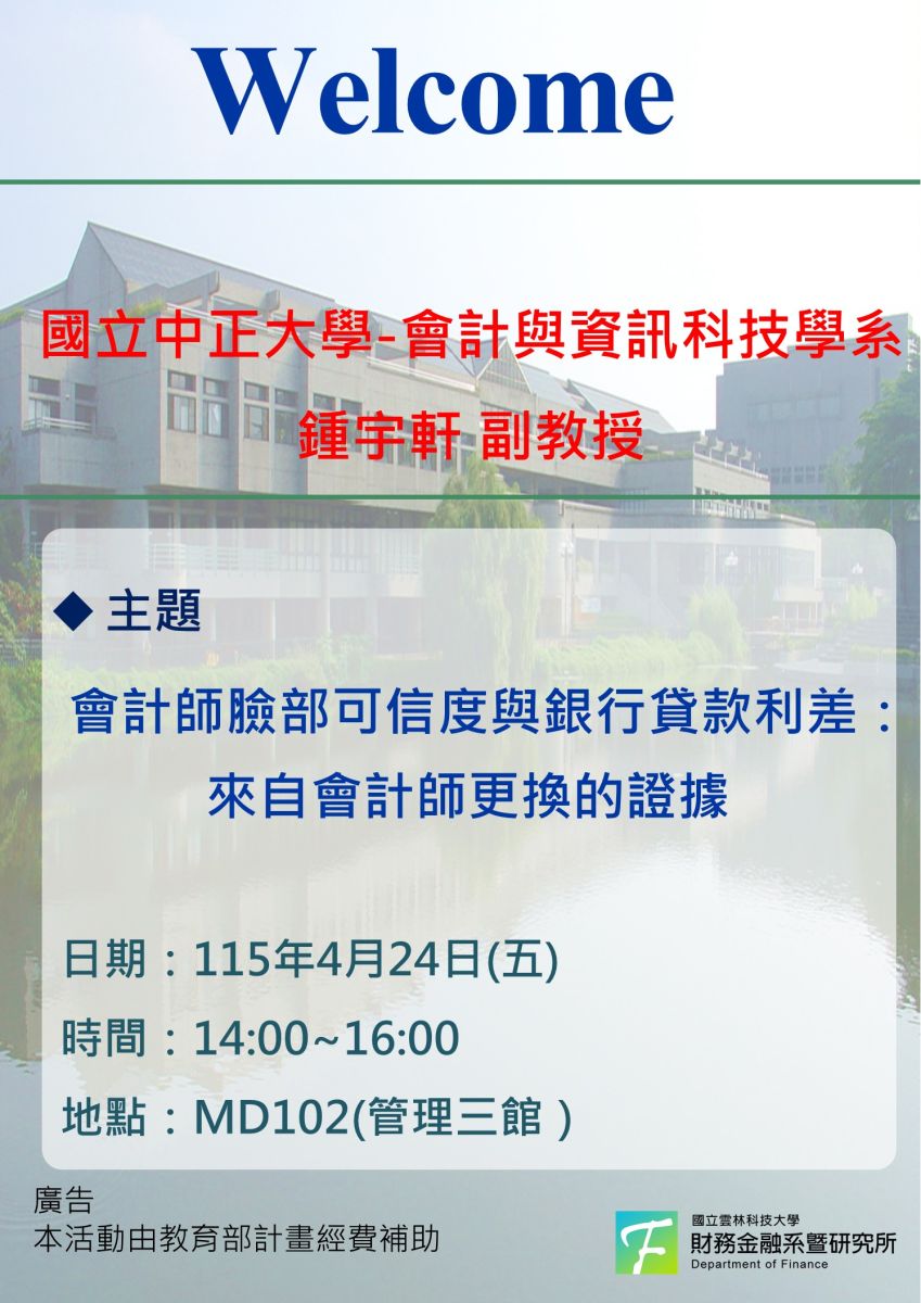 4/24(五)邀請中正大學會計與資訊科技學系鍾宇軒副教授專題演講
